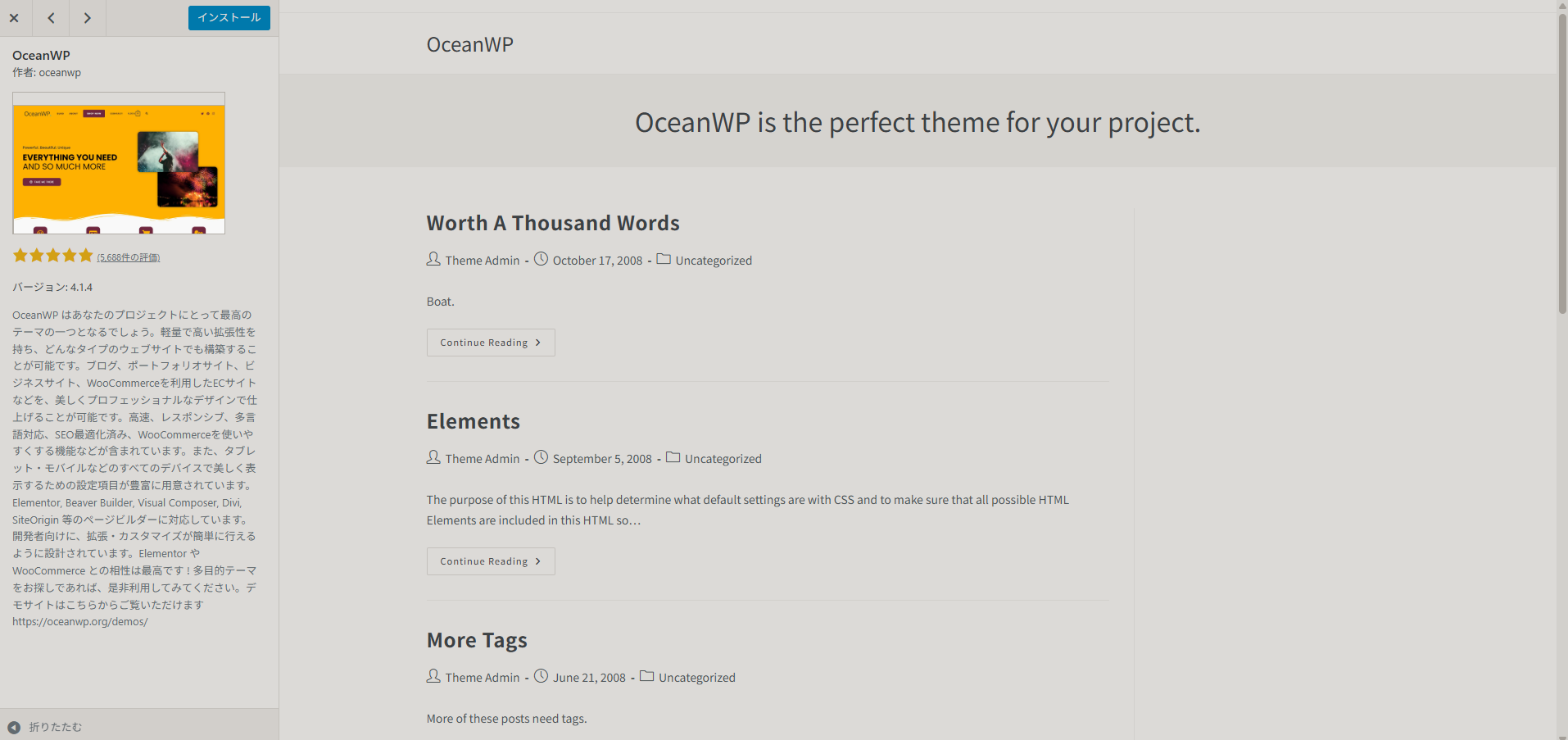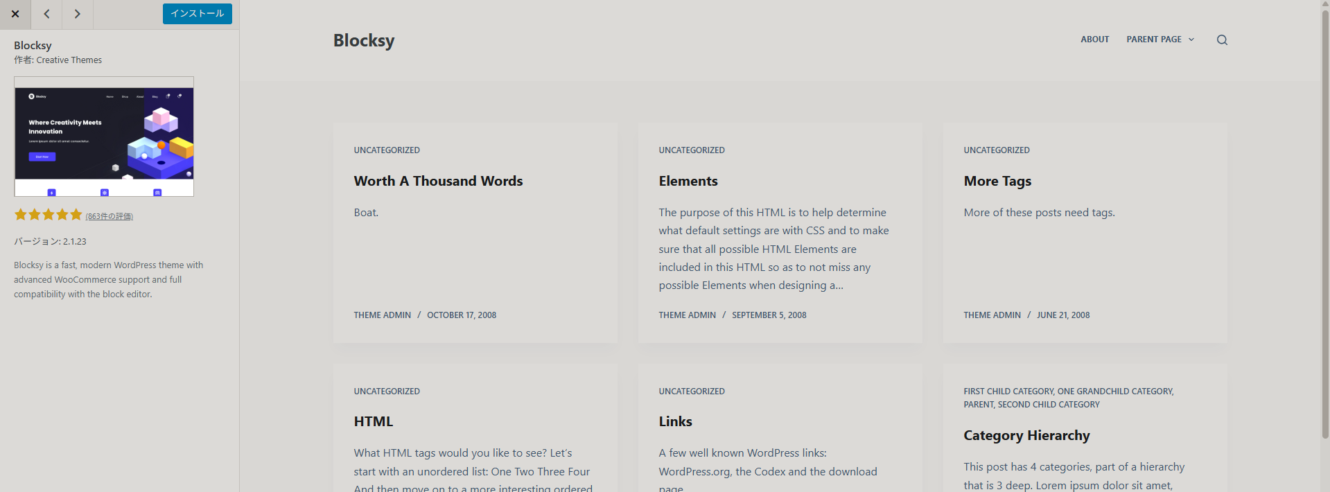 そこの上で、見た目がサンプル画像と異なるという点についてですが、テーマをインストール・有効化したからといって、デモサイトのような見た目のデザインになるとは限りません。