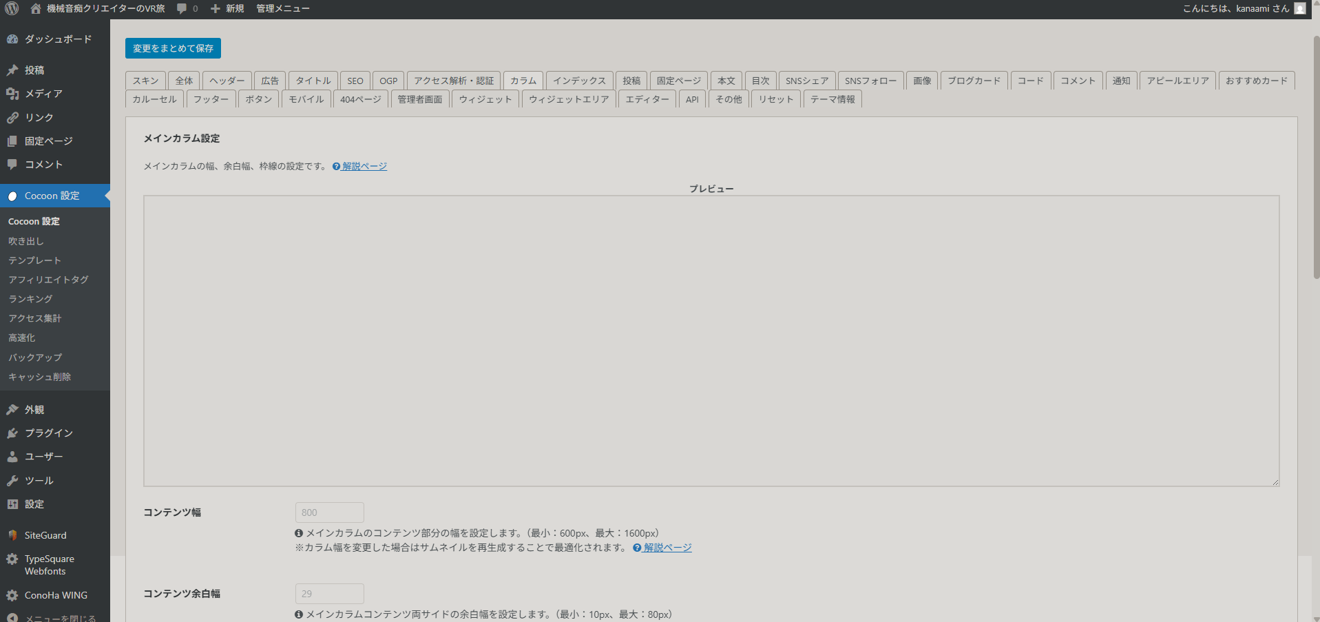 ・Cocoon設定内の「スキン」「全体」「カラム」「モバイル」「投稿」プレビューがまっさら。他の設定も、プレビューでスキンが反映されない基本のHTMLのみのような表示になっている。